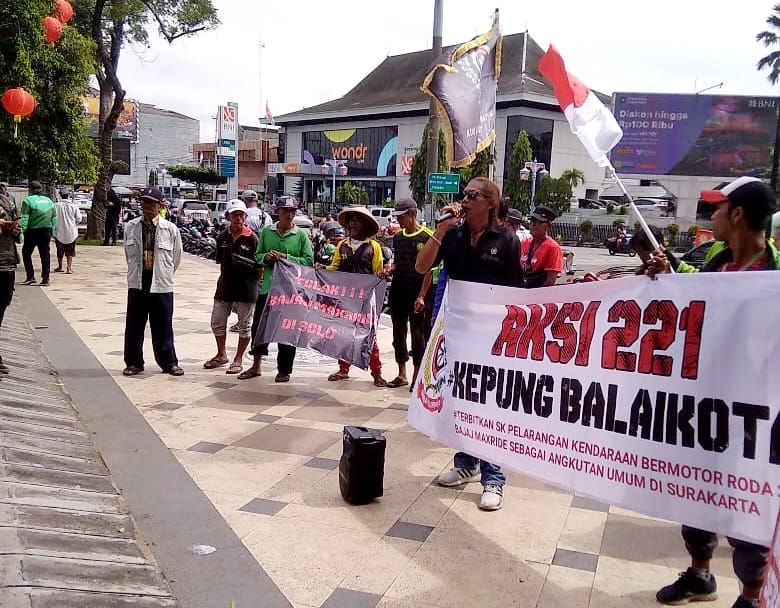 lingkarsolo.com – Puluhan Ojol Solo yang tergabung dalam Gabungan Aksi Driver Roda Dua (Garda) Solo Raya dan tukang becak, menggelar aksi demo di depan Balaikota Surakarta, Kamis, 22 Januari 2026. Demo yang berlangsung pagi tersebut, menolak Bajaj beroperasi di kota Solo. Dalam orasi aksi 221 Kepung Balaikota, meskipun sudah ada larangan beroperasi, namun pada kenyataannya, Bajaj masih berlalu lalang, bahkan ada di Jalur Utama kota Solo, tepatnya di Jalan Slamet Riyadi.