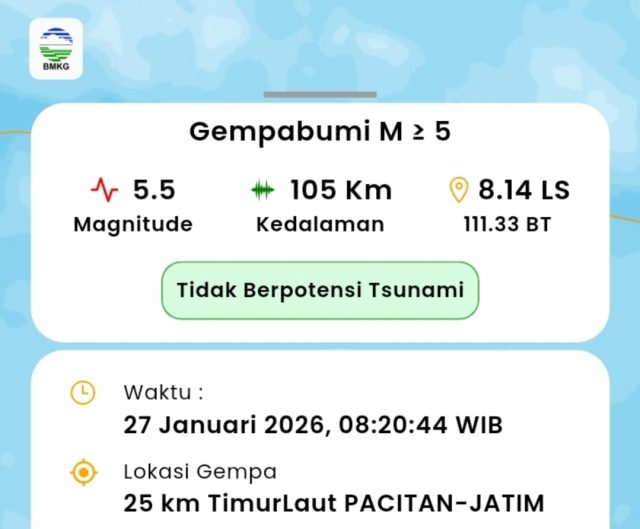 lingkarsolo.com – Gempa bumi berkekuatan magnitudo 5,5 mengguncang wilayah Pacitan, Jawa Timur, pada hari ini, Selasa, 27 Januari 2026, pukul 08.20 WIB. Getaran gempa dilaporkan terasa hingga sejumlah daerah di Jawa Tengah, termasuk Kota Solo dan Kabupaten Sukoharjo.