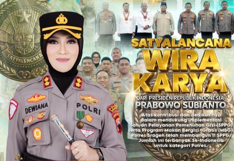 LINGKARSOLO, SRAGEN – Kinerja jajaran Polres Sragen kembali menuai apresiasi di tingkat nasional. Kapolres Sragen, Dewiana Syamsu Indyasari, menerima penghargaan Satyalancana Wira Karya dari Presiden Republik Indonesia sebagai bentuk pengakuan atas kontribusinya dalam mendukung program pelayanan gizi masyarakat.